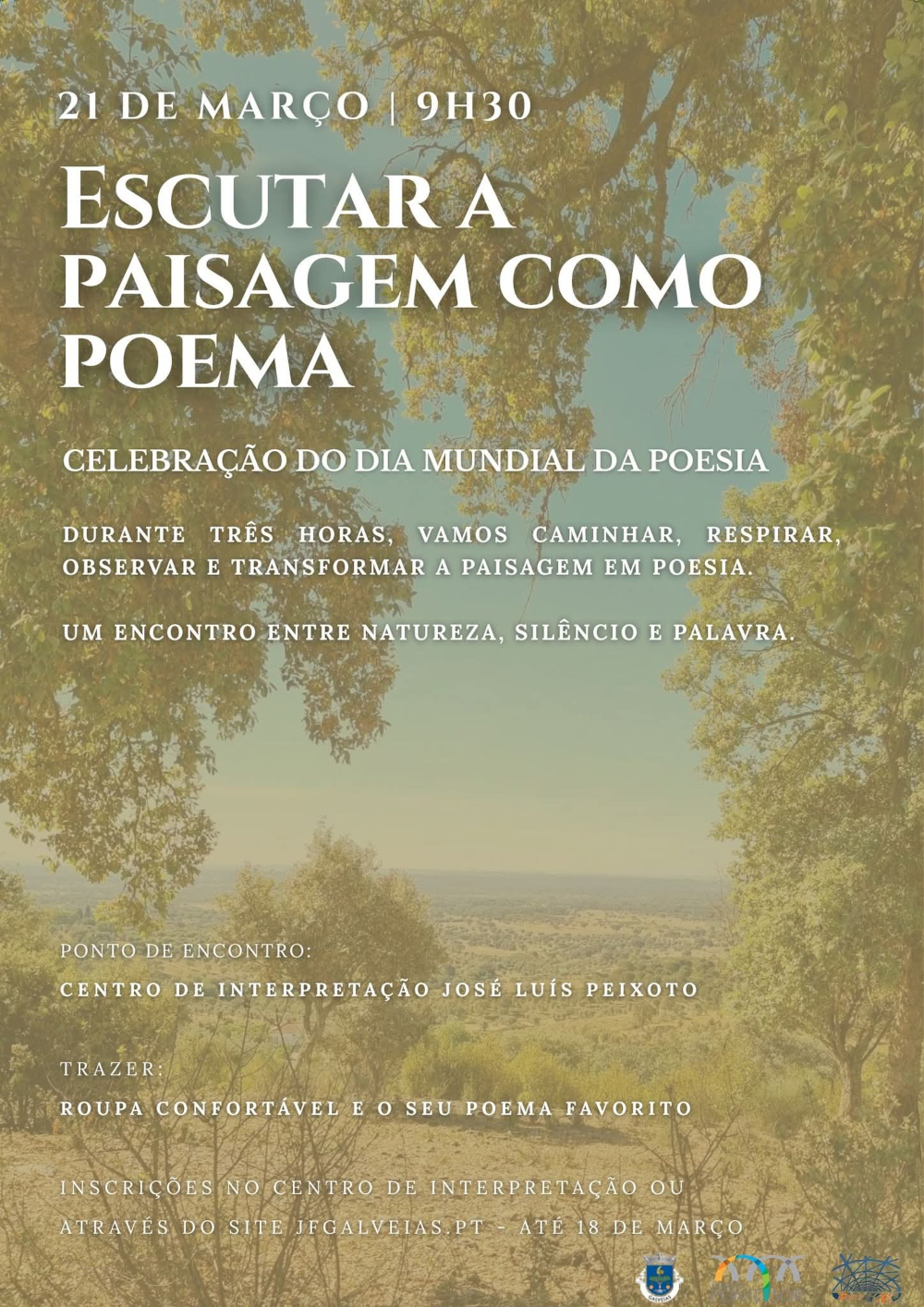 Durante três horas, iremos caminhar, respirar a paisagem, observar em silêncio e transformar cada detalhe em palavra. Um encontro entre natureza, silêncio e poesia, onde o território inspira versos e a escuta abre espaço à criação.